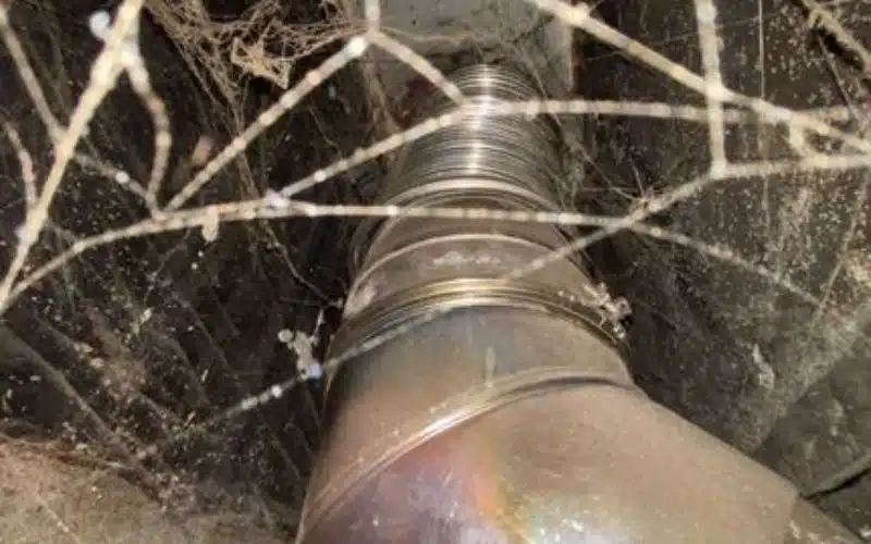 Conduit mal isolé, suintements et traces noires : -👉 Traces noires, suintements, condensation → signes d’un tirage défaillant et d’un risque d’incendie par bistre ou goudronnage.